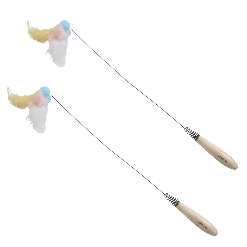 Vetanova Interactive Cat Toys Wand - Flexible Steel Wire Feather Teaser with Natural Wooden Handle and Spring, Durable Cat Wand for Indoor Cats and Kittens Exercise and Play.